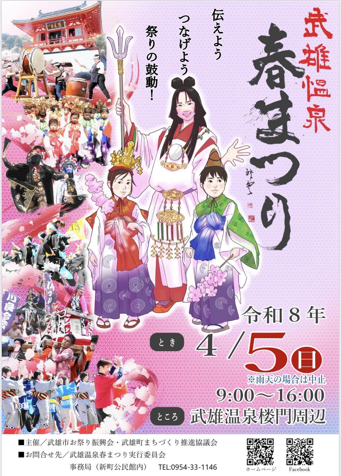2024/04/05 ~ 2024/04/05|春 2026武雄温泉春まつり 伝えよう、つなげよう、祭りの鼓動! 【武雄温泉春まつり】 日程:令和8年4月5日(日) ※令和8年は本まつりのみの開催となります。 ※雨天の場合は中止となります。 会場:武雄温泉楼門付近 主 催 武雄市お祭り振興会・武雄町まちづくり推進協議会 お問合せ 武雄温泉春まつり実行委員会 事務局(新町公民館内)電話0954-33-1146 ◆武雄温泉春まつりのホームページはこちら ◆Facebookはこちら « 前へ 一覧へ
