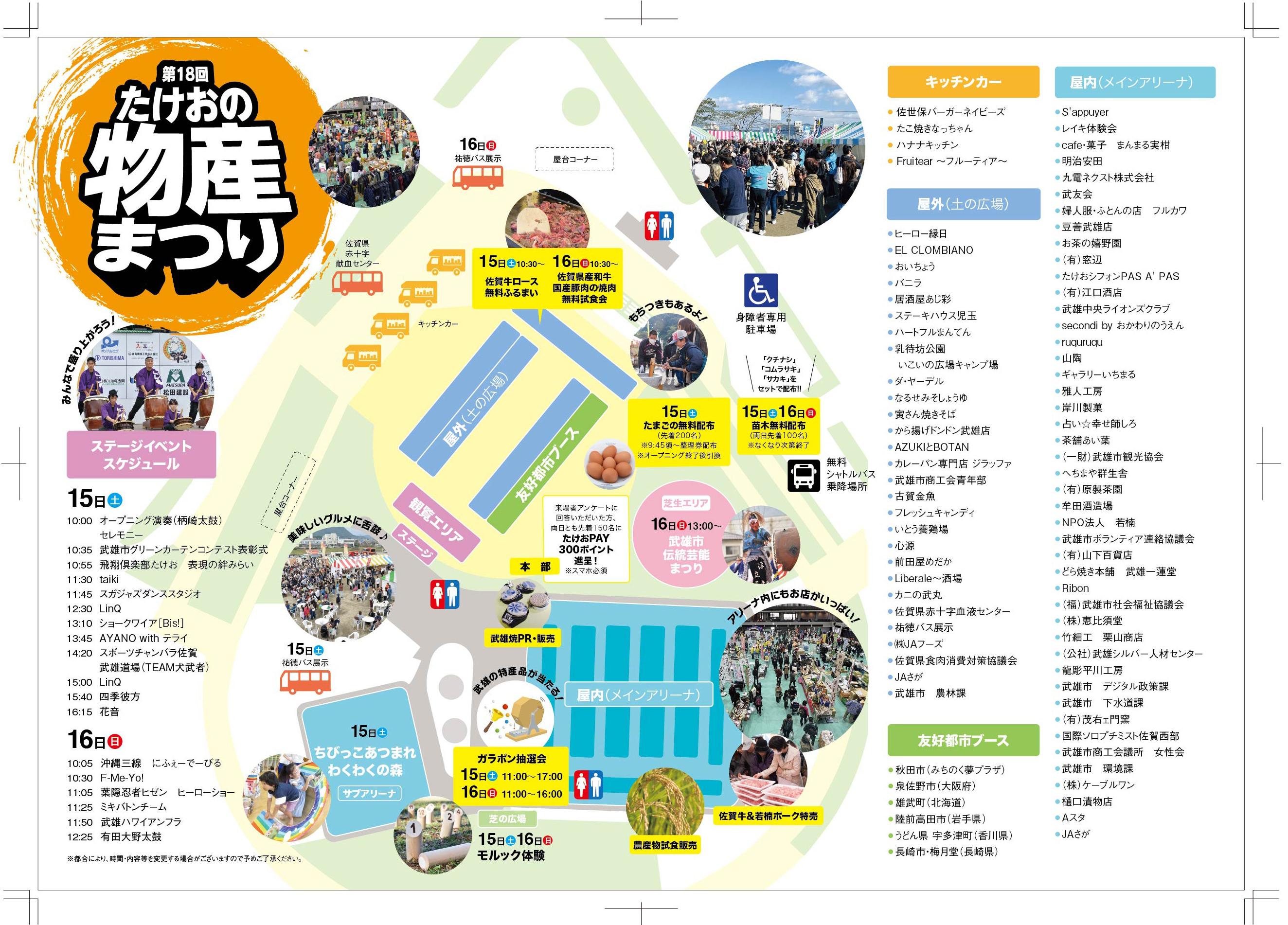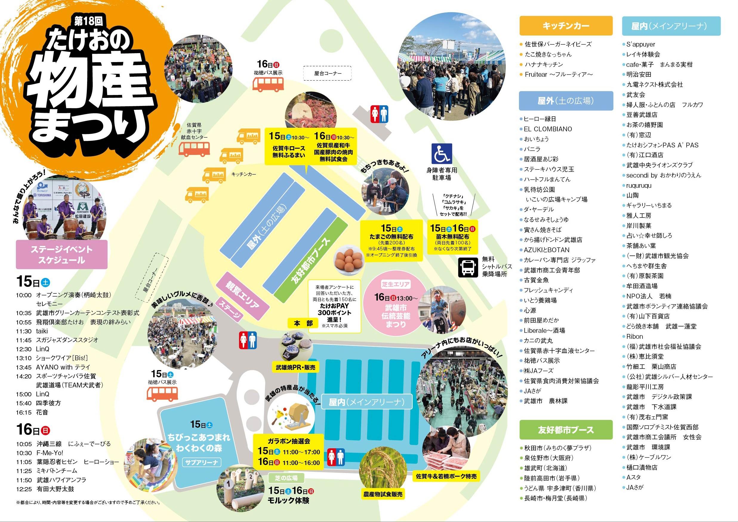 今年も、武雄市内の特産品の販売や毎年恒例となっている友好都市(雄武町、陸前高田市、宇多津町、泉佐野市、秋田市、長崎市)の特産品はもちろん、ステージイベントの他、モルック体験、武雄市伝統芸能まつりなどの企画も同時開催いたします。