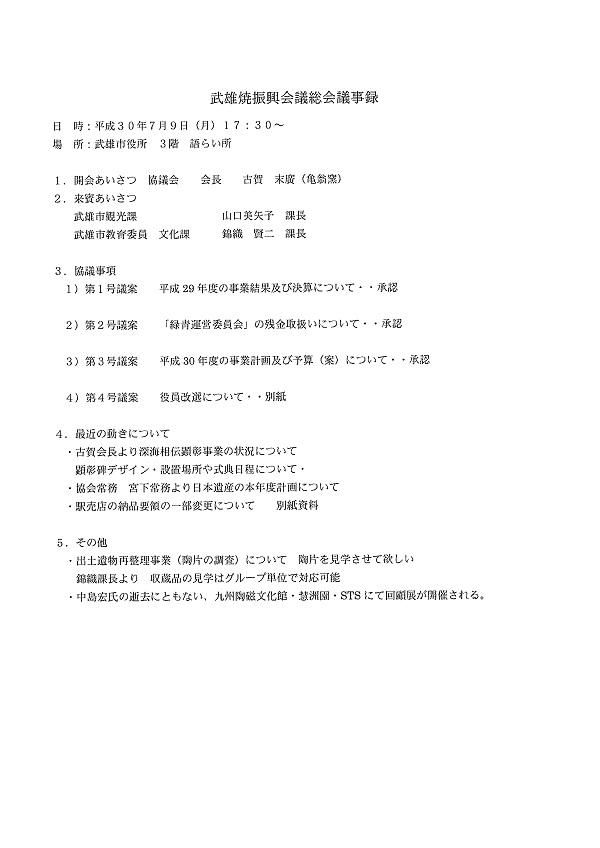 2018/07/11 武雄焼振興会議総会が開催されました 平成30年7月9日 武雄市役所3階語らい所にて武雄焼振興会議総会が開催されました。 協議内容は平成29年度事業結果・決算、「緑青運営委員会」残金の取り扱い、平成30年度事業計画・予算、役員改選等について協議されました。 « 前へ 一覧へ 次へ »