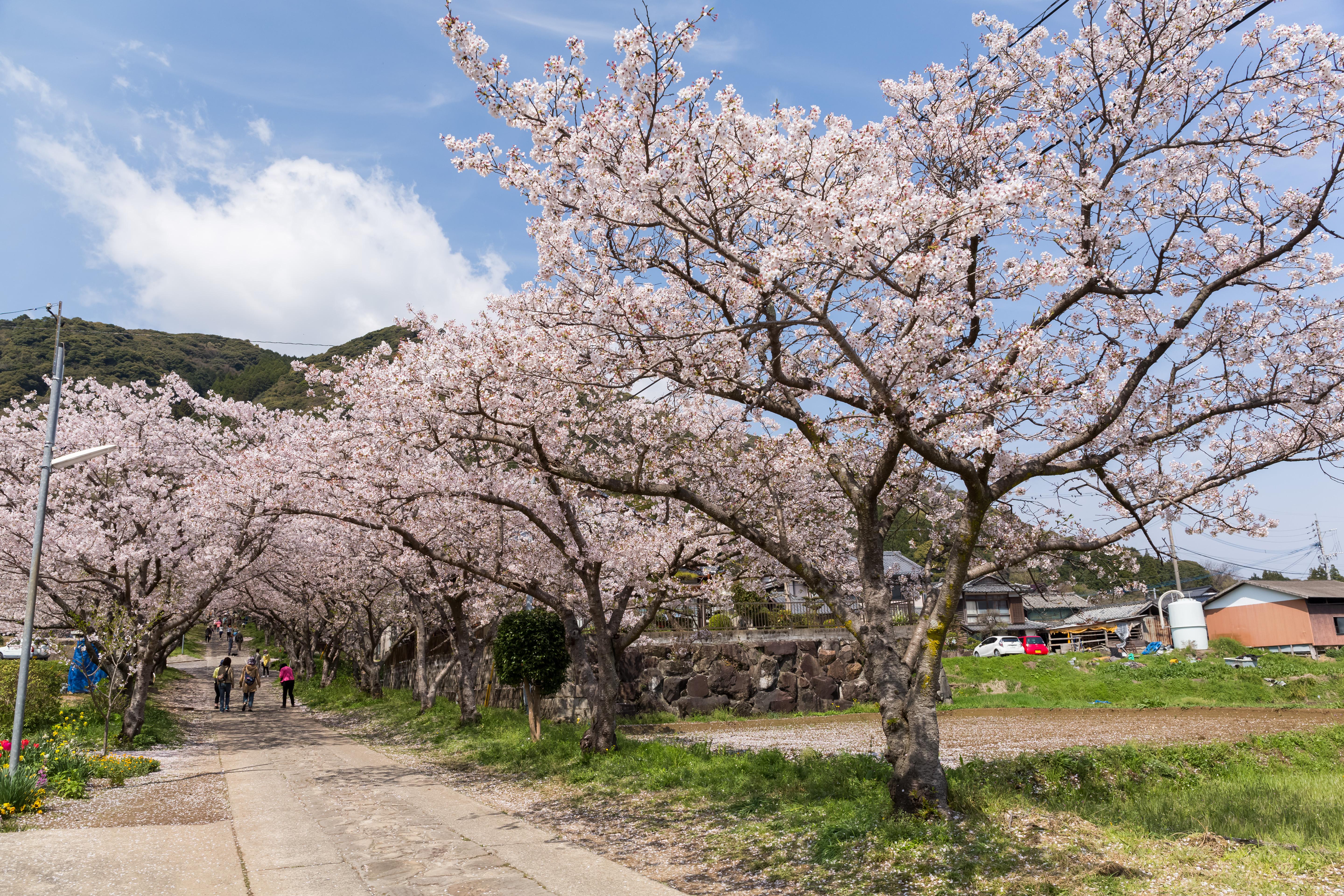 春には参道に約100本の桜が咲き、見事な桜のトンネルを作り出す。(3月中旬~4月初旬頃)